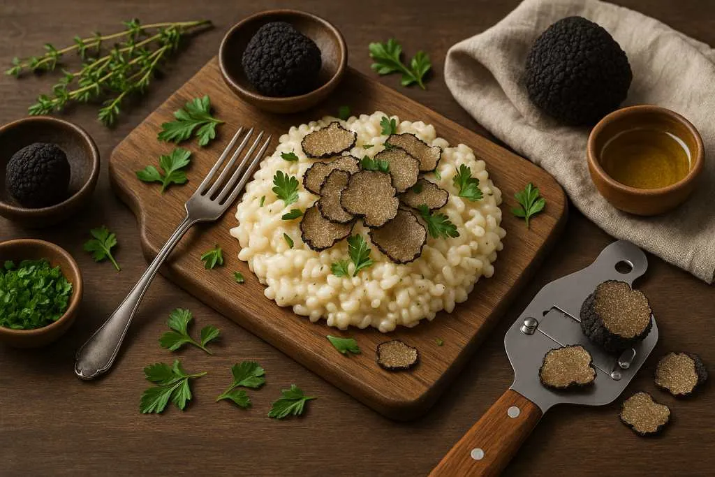 In der Kombination mit Kräutern entfalten Trüffel eine besonders spannende Wirkung. Ihre erdige Tiefe kontrastiert wunderbar mit der Frische von Schnittlauch oder der Würze von Petersilie. Ein klassisches Kräuter-Risotto zum Beispiel gewinnt mit ein paar hauchdünn gehobelten Trüffelscheiben an aromatischer Tiefe, ohne seine Leichtigkeit zu verlieren. Auch eine Kräuterbutter mit einem Hauch Trüffelöl – wohlgemerkt aus echter Trüffelessenz, nicht bloß Aroma – kann ein schlichtes Baguette in eine Vorspeise mit Wow-Effekt verwandeln.